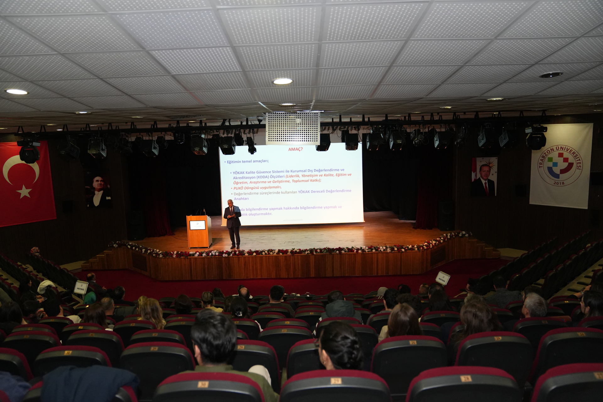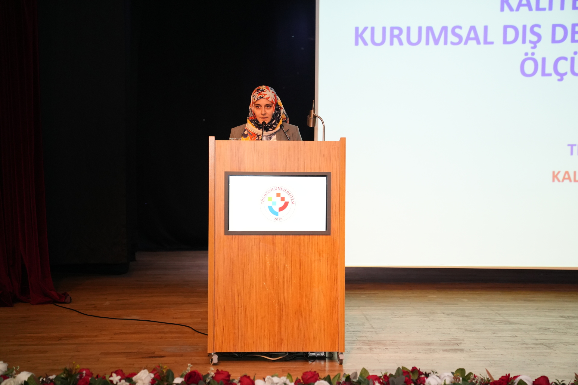 Üniversitemiz Kalite Koordinatörü Doç. Dr. Selcen Sarı Aytekin ve Öğr. Gör. Tuba Bazancir’in hazırladığı iki aşamalı etkinlikte takdimi Öğr. Gör. Funda Hatipoğlu gerçekleştirdi. Soru-cevap aşamasıyla tamamlanan etkinlikte kalite süreçlerinden sorumlu personelimiz sahneye yansıtılan kriterlere ilişkin bilgi ve maddeleri ilgiyle takip etti.