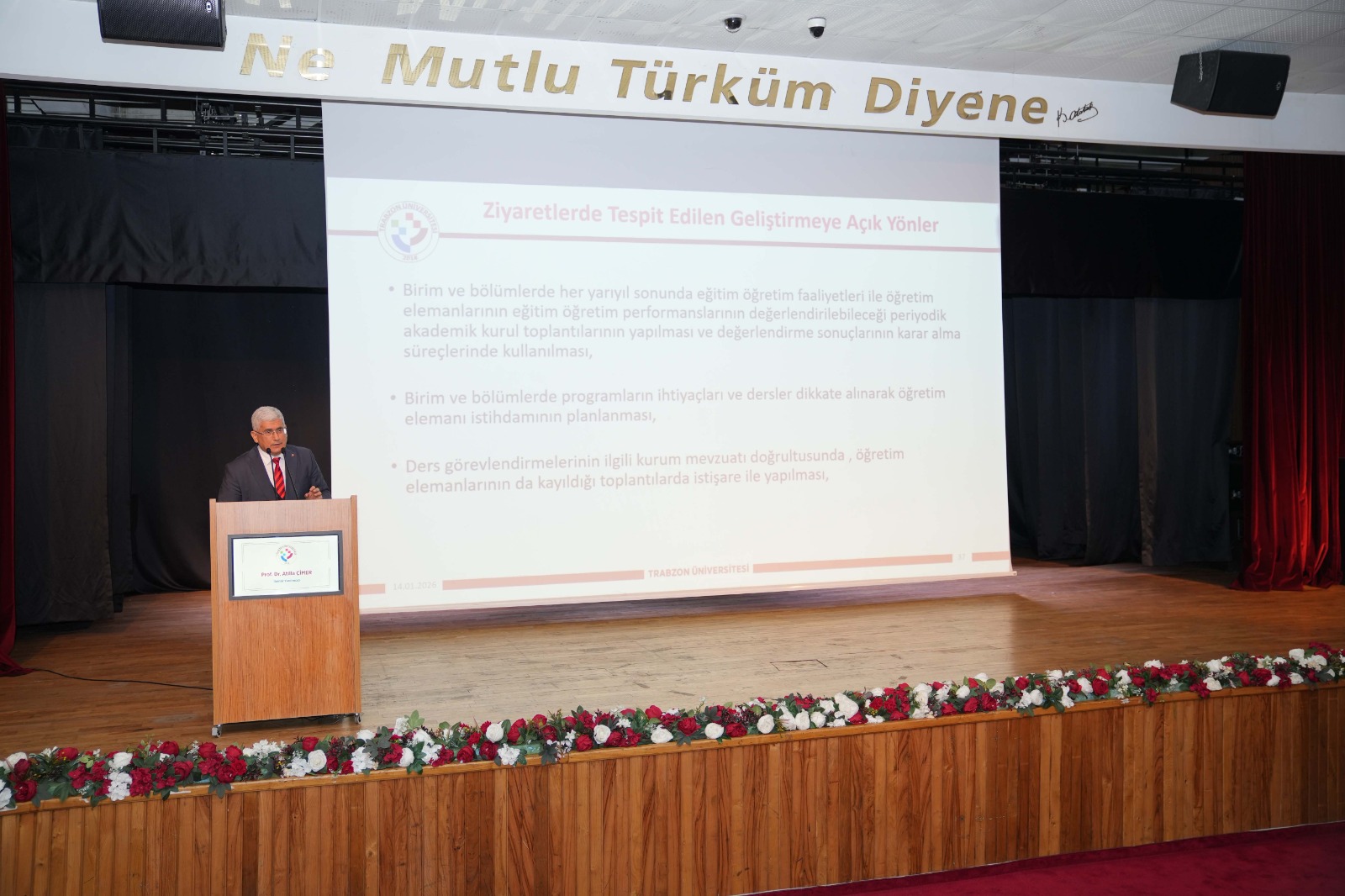 Üniversitemizin “2025 Yılı Kalite Güvence Sistemi ve Akreditasyon Çalışmaları ve Akademik Birimler Performans Değerlendirme Toplantısı” adı altındaki değerlendirme toplantısı Rektörümüz Prof. Dr. Emin Âşıkkutlu başkanlığındaki programla gerçekleştirildi. Trabzon Üniversitesi 2024 ve 2025 yılları Performans Değerlendirme ve Akreditasyon Süreçleri Değerlendirme Toplantıları üç güne (14-16 Ocak 2026) yayıldı. İlk gün açılışı Mahmut Goloğlu Kültür Merkezinde yapılan toplantı takip eden iki gün Rektörlük Senato Salonunda devam etti.