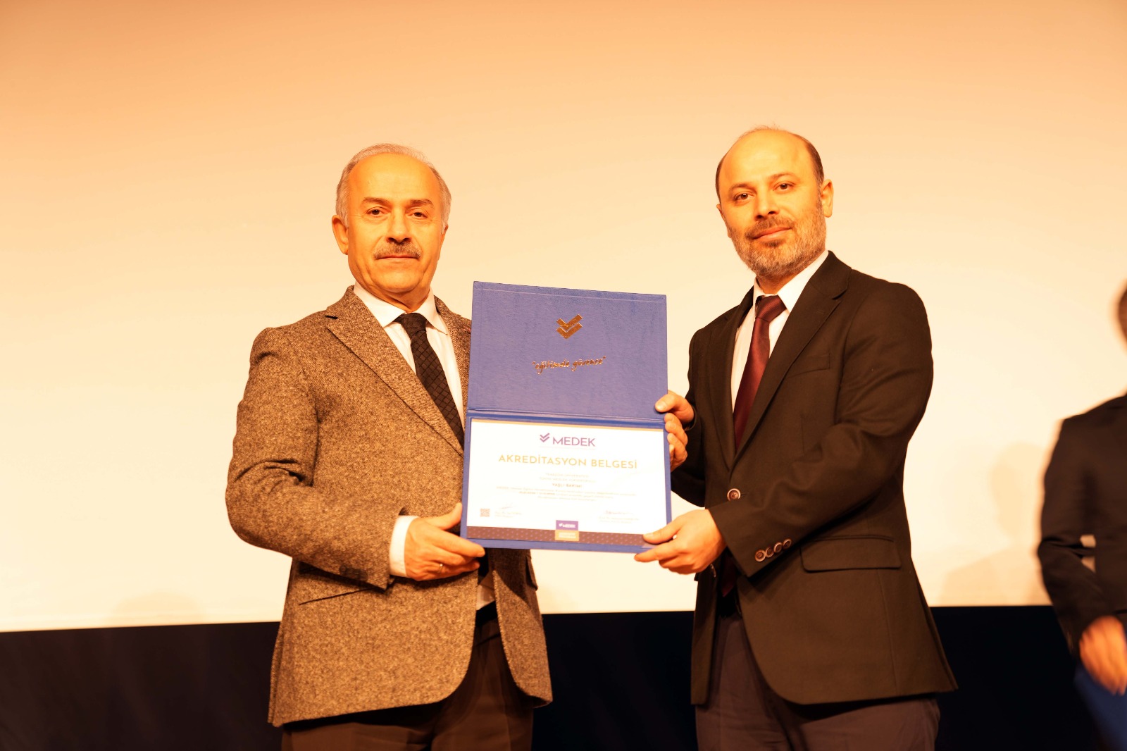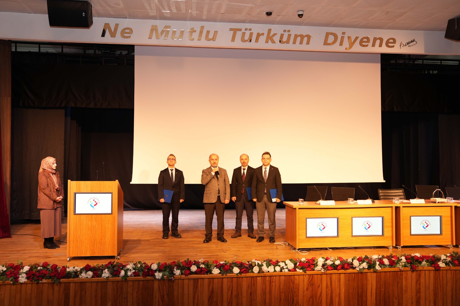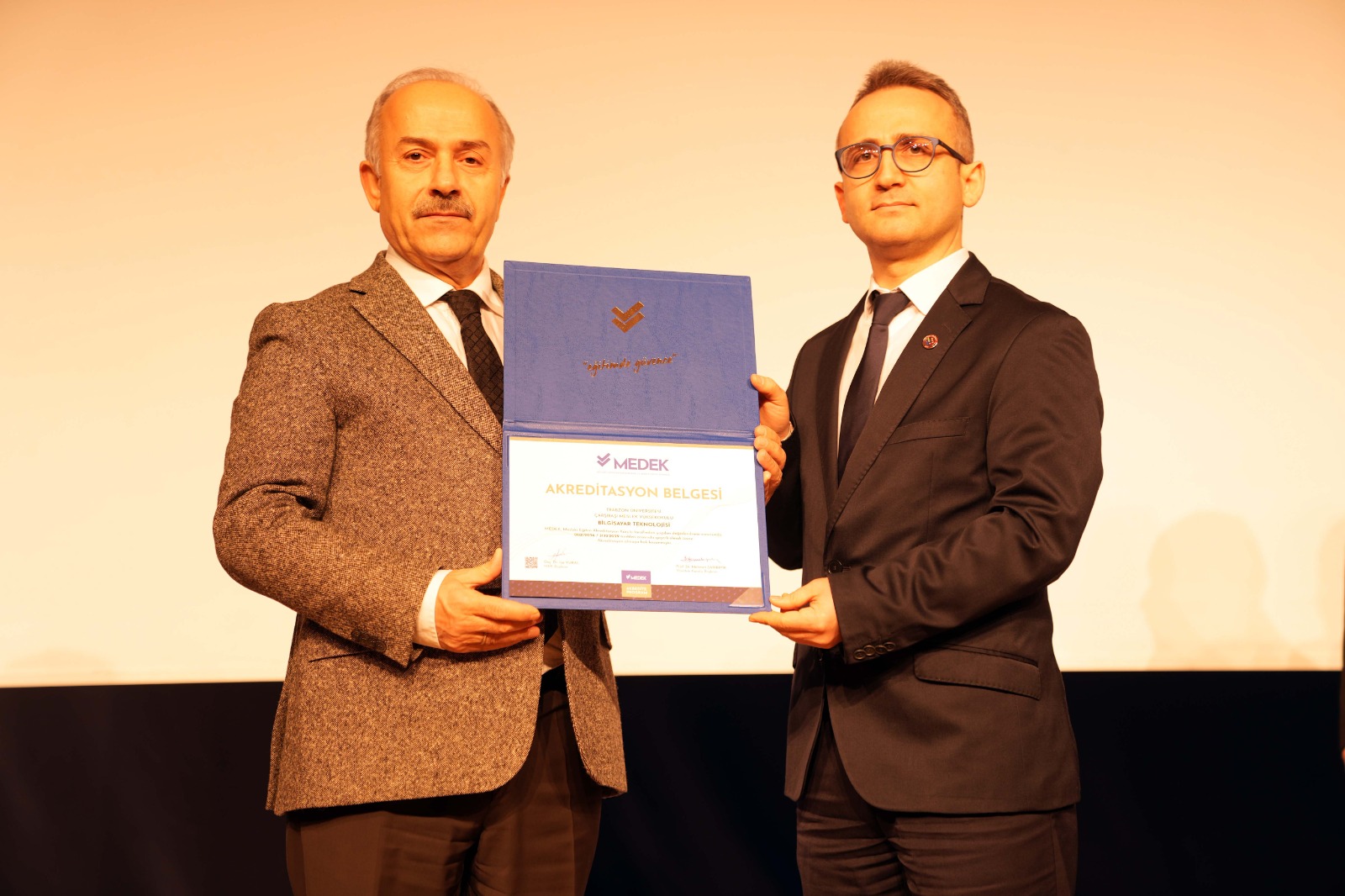 Ardından 2025 yılında programları akredite edilen üç meslek yüksekokulunun müdürlerine Rektörümüz Prof. Dr. Emin Âşıkkutlu tarafından MEDEK tarafından düzenlenen Akreditasyon Belgeleri takdim edildi. Beşikdüzü Meslek Yüksekokulu Müdürümüz Dr. Öğr. Üyesi Ertuğrul Karoğlu, Çarşıbaşı Meslek Yüksekokulu Müdürümüz Dr. Öğr. Üyesi Lokman Şılbır ve Tonya Meslek Yüksekokulu Müdürümüz Dr. Öğr. Üyesi Galip Usta da Rektörümüze teşekkür ettiler.
