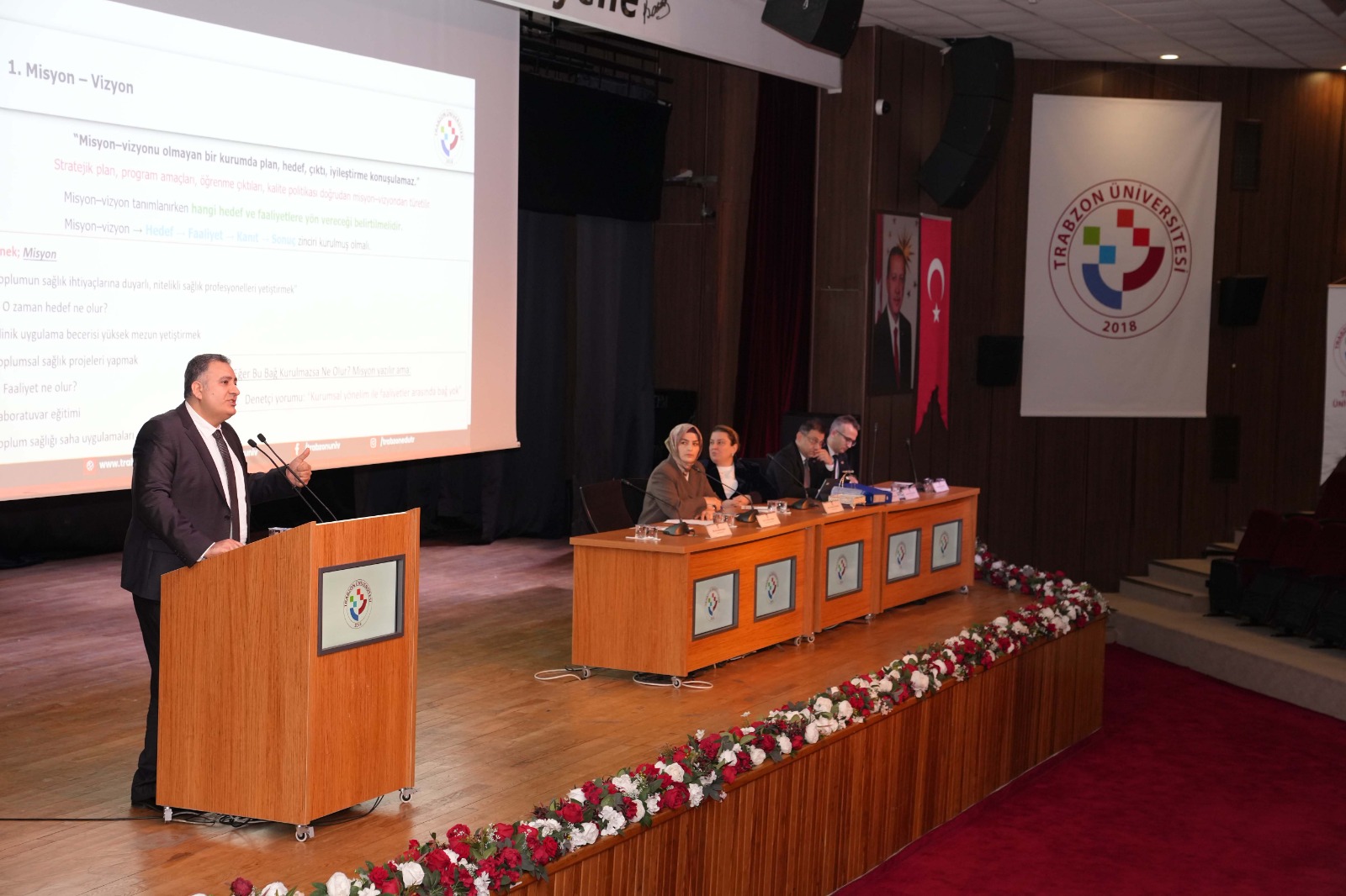 Programda, Beşikdüzü Meslek Yüksekokulu Müdürümüz Dr. Öğr. Üyesi Ertuğrul Karoğlu, Çarşıbaşı Meslek Yüksekokulu Müdürümüz Dr. Öğr. Üyesi Lokman Şılbır ve Tonya Meslek Yüksekokulu Müdürümüz Dr. Öğr. Üyesi Galip Usta’nın yanı sıra İlahiyat Fakültesi Dekan Yardımcımız Doç. Dr. Semra Cinemre, Kalite Koordinatörümüz Doç. Dr. Selcen Sarı Aytekin moderatörlüğünde kalite süreçlerine ilişkin görüşlerini sıraladı. Aytekin, “Birbirinden beslenen, birbirini destekleyen ve ortak akıl oluşturmayı hedefleyen bir eğitim programı planladık. Sunulacak görüşler bu yolda yürüyen meslektaşlarımıza ışık olacaktır” diyerek sözü sunuculara bırakırken, yönetici öğretim üyelerimiz de kalite süreçlerine ilişkin deneyim ve tavsiyelerini katılımcılarla paylaştı.