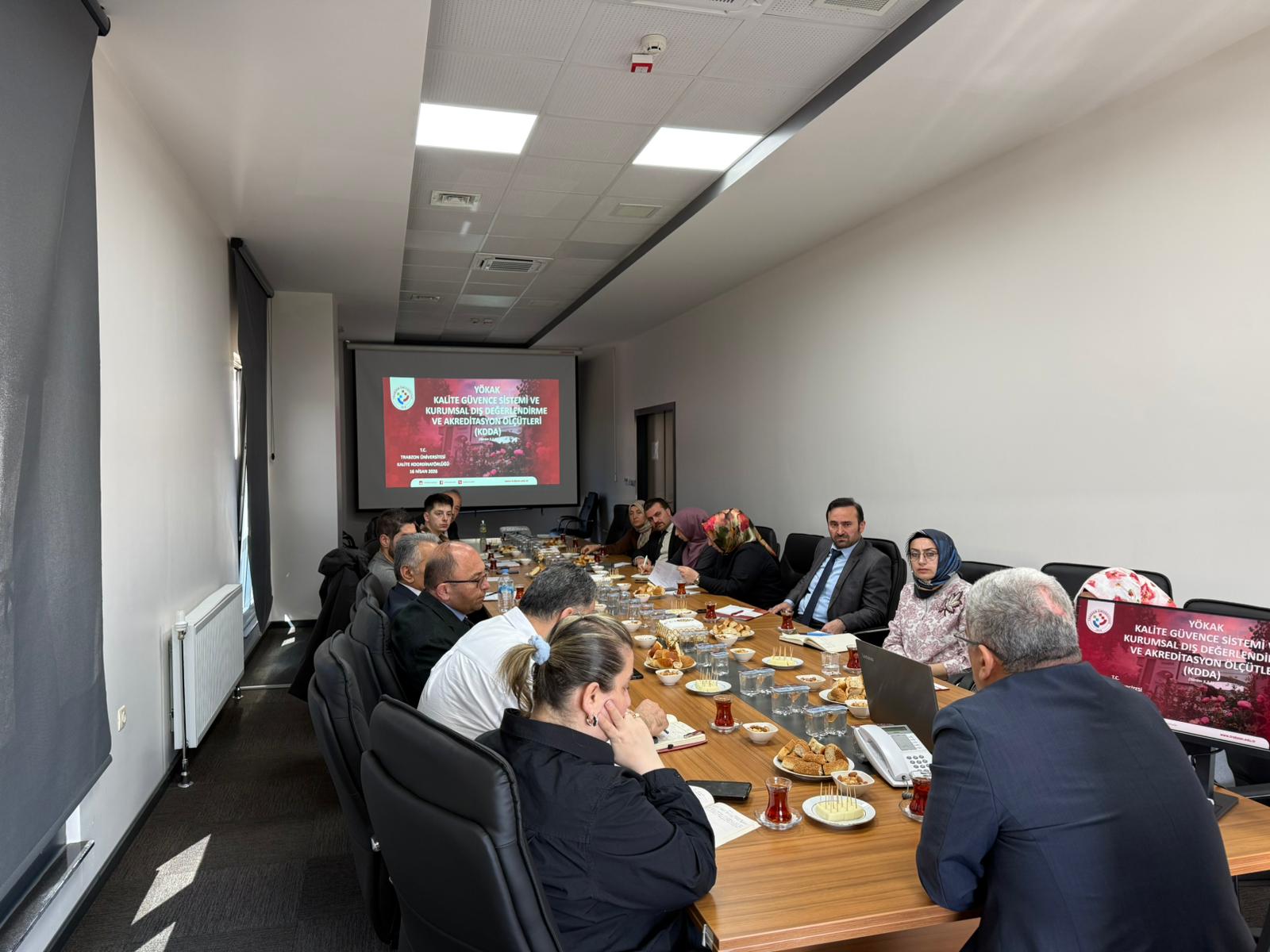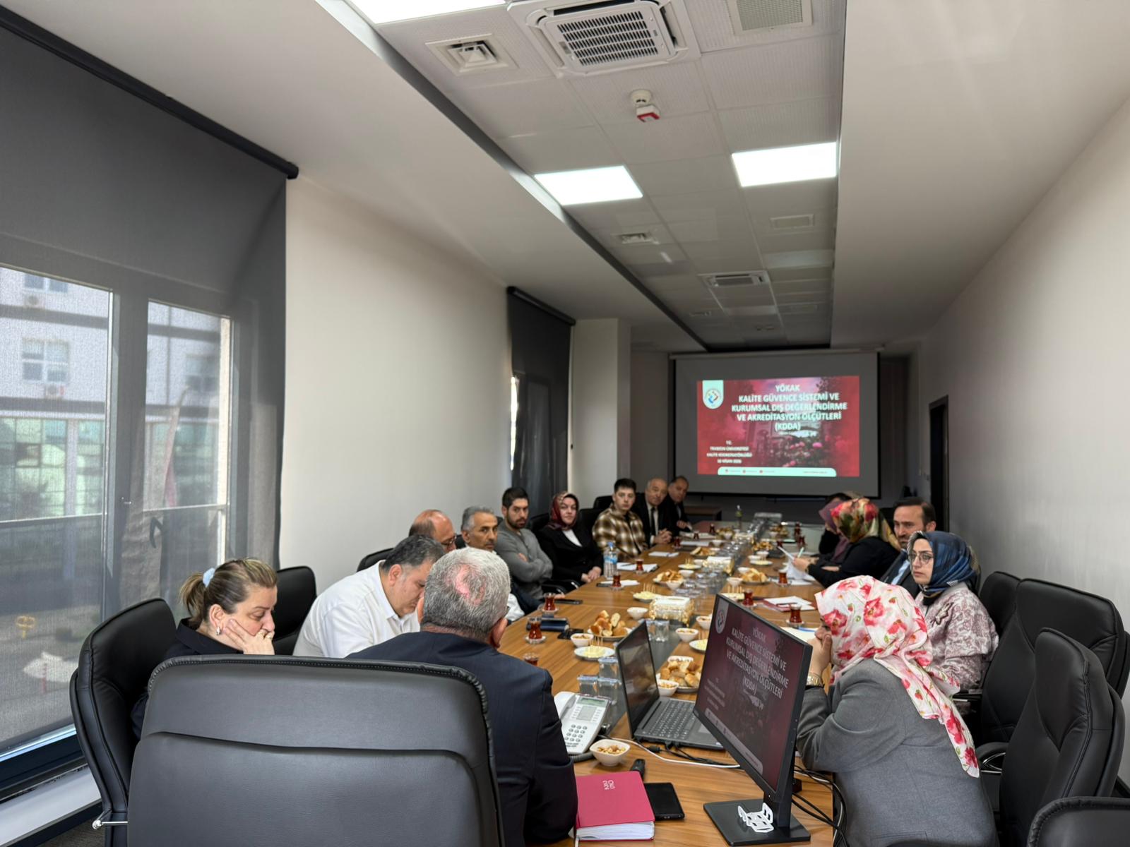 Toplantıda, Yükseköğretim Kalite Kurulu (YÖKAK) tarafından belirlenen Kalite Güvence Sistemi ile Kurumsal Dış Değerlendirme ve Akreditasyon Ölçütleri (Sürüm 3.2.1) hakkında kapsamlı bilgiler paylaşıldı. Sunumda özellikle; liderlik, yönetişim ve kalite, eğitim-öğretim, araştırma-geliştirme ve toplumsal katkı başlıkları çerçevesinde yürütülen kalite çalışmaları ele alındı.